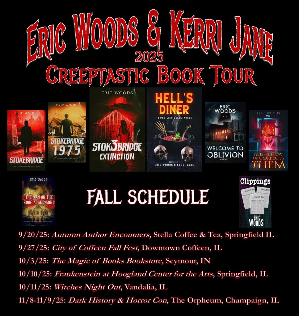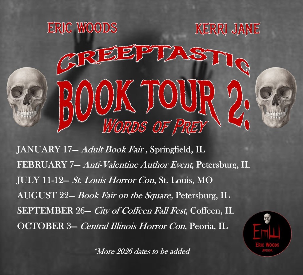 A writer since grade school, Eric Woods reluctantly resides in Springfield, Illinois and finally published his first novel in 2018. Today he has nine published novels, two novellas, and one collection of horror short stories co-written with author Kerri Jane. In 2024, Eric released the first two novels of a trilogy. You can order both – STOKEBRIDGE and the prequel, STOKEBRIDGE 1975, in eBook, audiobook, and SIGNED paperback! The trilogy recently concluded with STOK3BRIDGE: Extinction, now available in paperback and eBook!