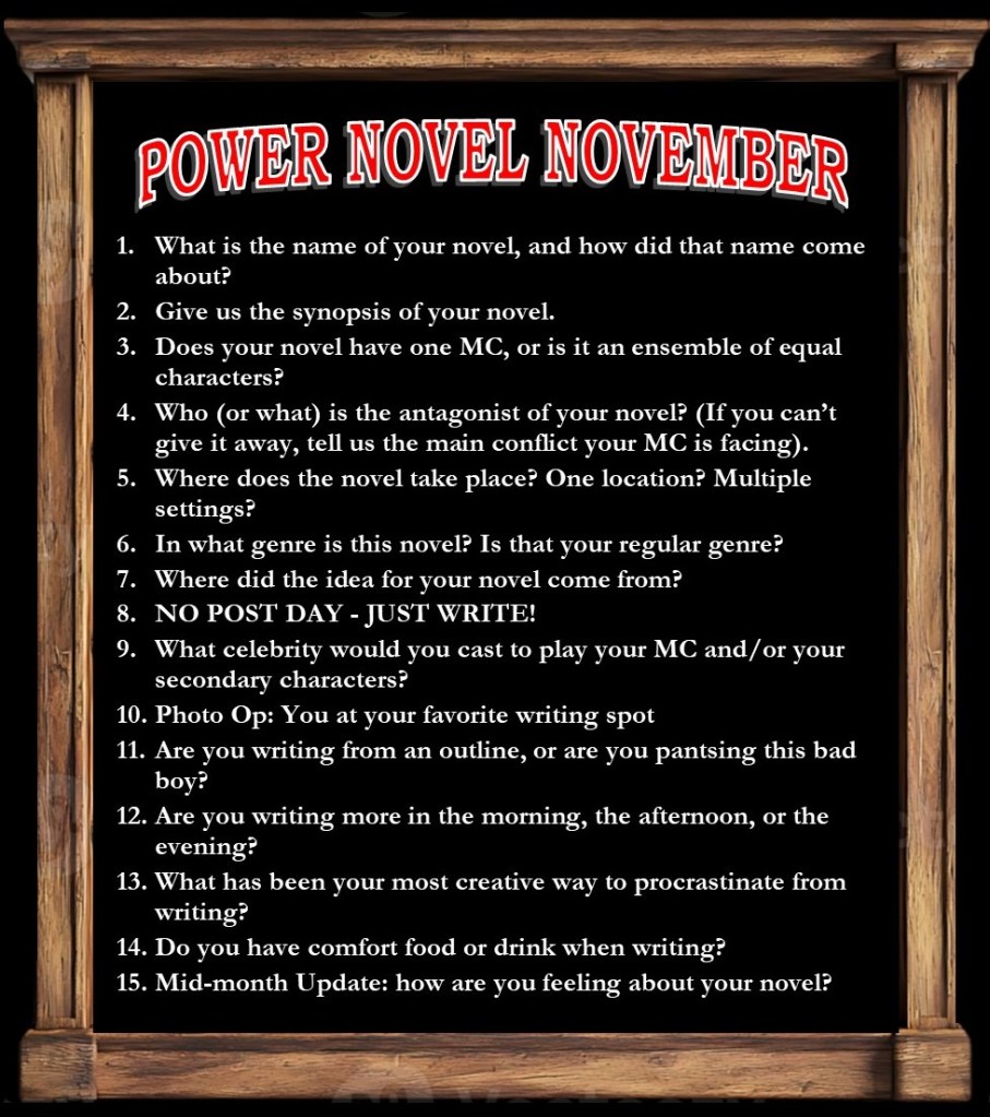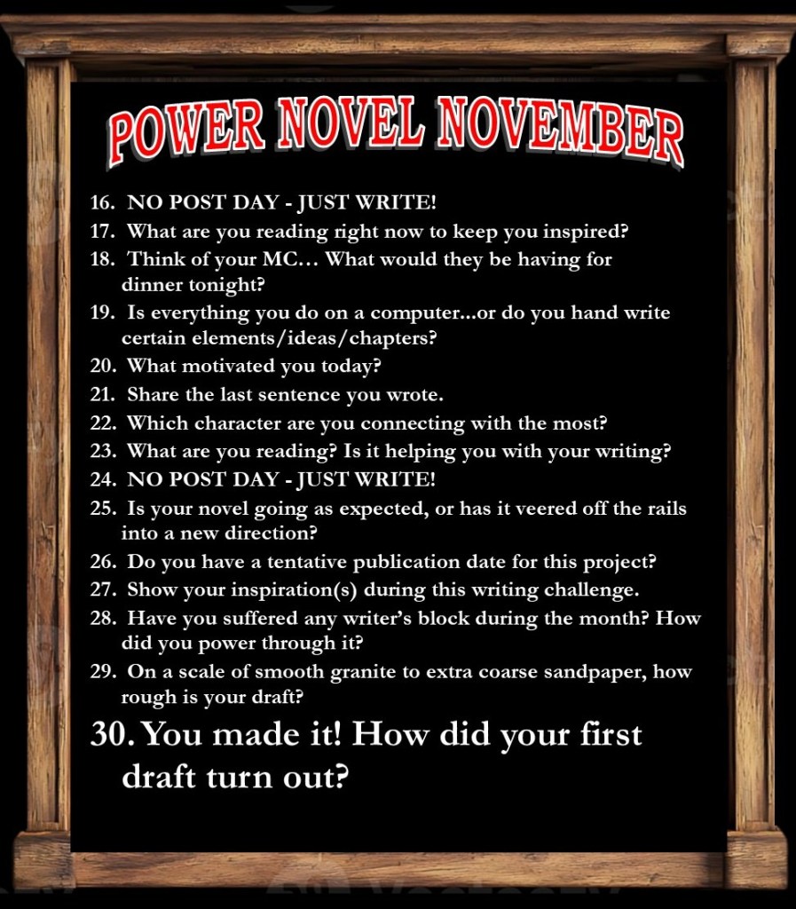 Who wants to be involved in something I’m calling 𝓟𝓞𝓦𝓔𝓡 𝓝𝓞𝓥𝓔𝓛 𝓝𝓞𝓥𝓔𝓜𝓑𝓔𝓡 (patent pending)? I am challenging myself to power through the first draft of a new novel during the month of November (something I have successfully done for the three previous Novembers). I would like it if others would join in on the challenge! There is no word count minimum, so you won’t be stressed out by getting behind on a specific day. The idea here is to challenge yourself to complete the first draft of a new story.